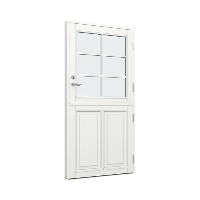 Hafðu í huga að helminguð hurð opnast alltaf út. Húnn er festur á neðri hluta hurðarinnar og húnn og sílinder á þann efri.