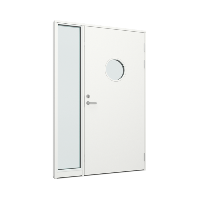 hurð slétt með kringlóttum glugga og hliðarþili með 1 gleri (TR-DP-003-11)