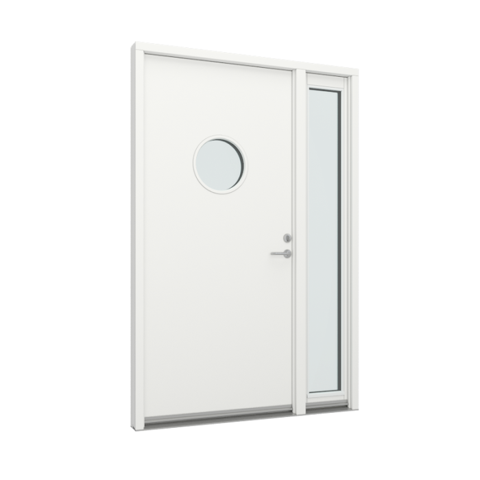 hurð slétt með kringlóttum glugga og hliðarþili með 1 gleri (TR-DP-003-11-IN)