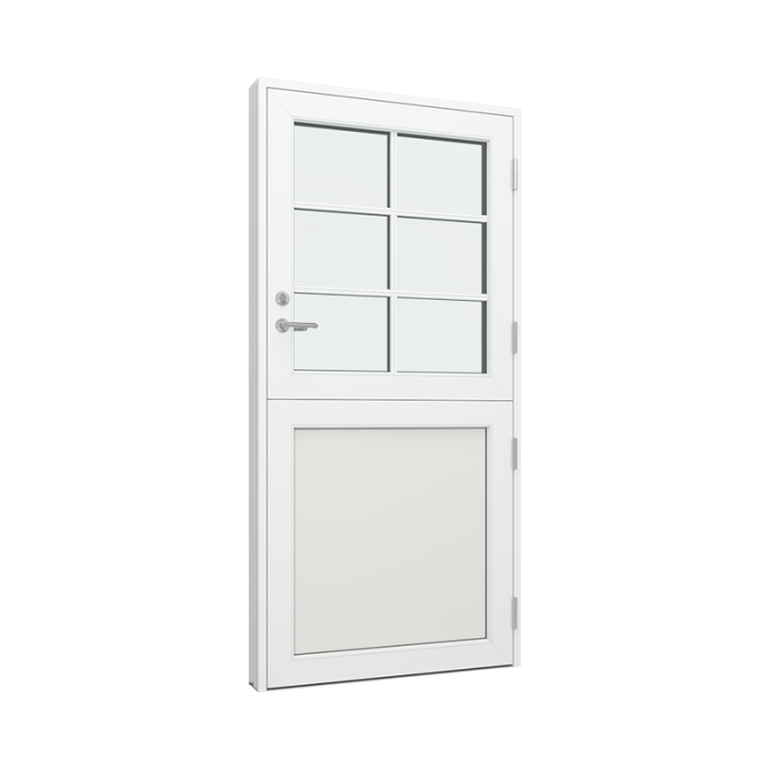 Hafðu í huga að helminguð hurð opnast alltaf út. Húnn er festur á neðri hluta hurðarinnar og húnn og sílinder á þann efri.