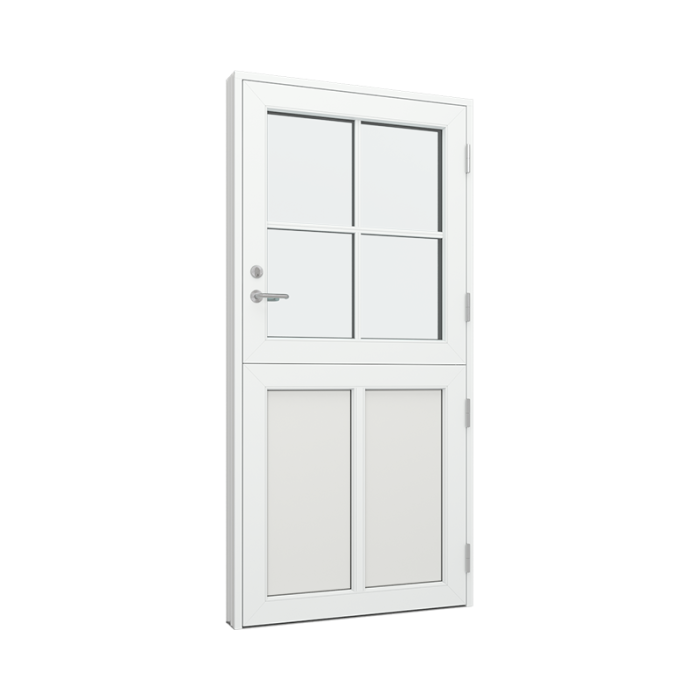 Hafðu í huga að helminguð hurð opnast alltaf út. Húnn er festur á neðri hluta hurðarinnar og húnn og sílinder á þann efri.