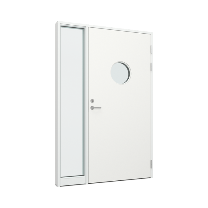 hurð slétt með kringlóttum glugga og hliðarþili með 1 gleri (TRAL-DP-003-11)